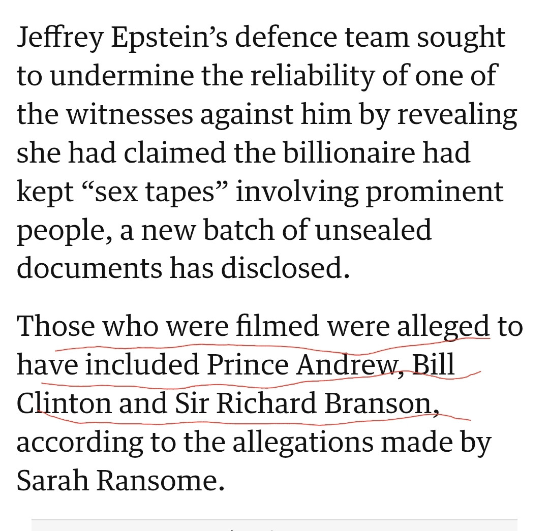Epstein documents allege sex tapes of Clinton, Prince Andrew and Richard Branson | The Independent https://share.google/3mXRt...
