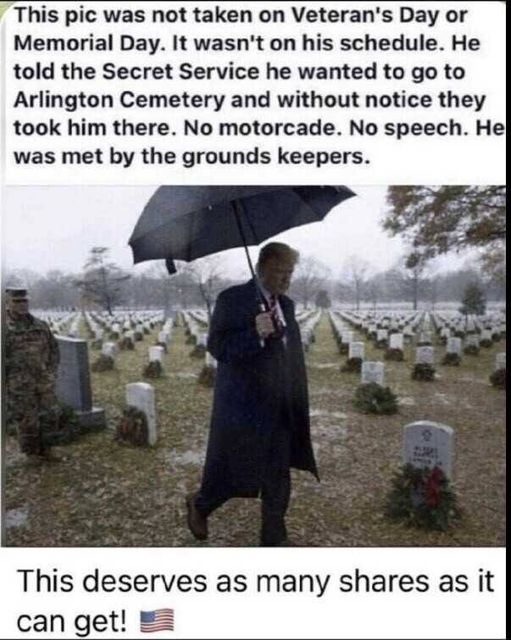 Seeing all those tombstones knowing a cabal of evil miscreants had all these precious patriot souls slaughtered and used as cannon fodder to line their pockets and depopulate sickens me to my very core . I've never known such a level of disgust . I'm sure President Trump is thinking along those lines as he walks among those headstones . Drawing strength and resolve to renew his spirit to see this war won . God bless you Mr. President . You "Sir" are the "Real Deal. "Carizzer"