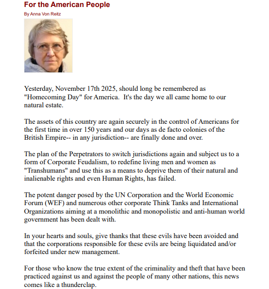 There’s also a YouTube video circulating with the title “Its Done! America is Now Free! We Had To Be First So We Could Help Others ~ Anna Von Reitz 11/17/2025,” which echoes that same celebratory framing of that date.