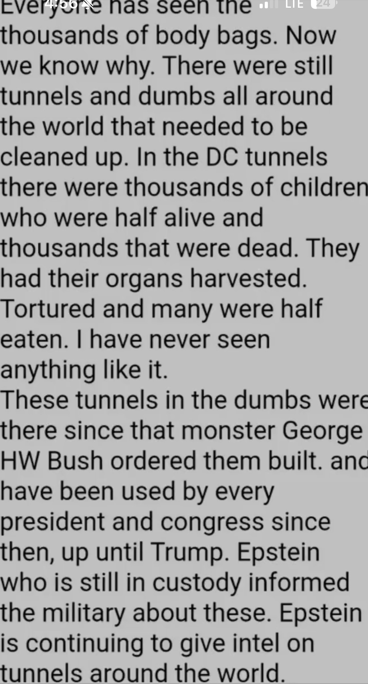 Tortured and many were half eaten. I have never seen anything like it. These tunnels in the dumbs were there since that monster George HW Bush ordered them built. anc have been used by every president and congress since then, up until Trump. Epstein who is still in custody informed the military about