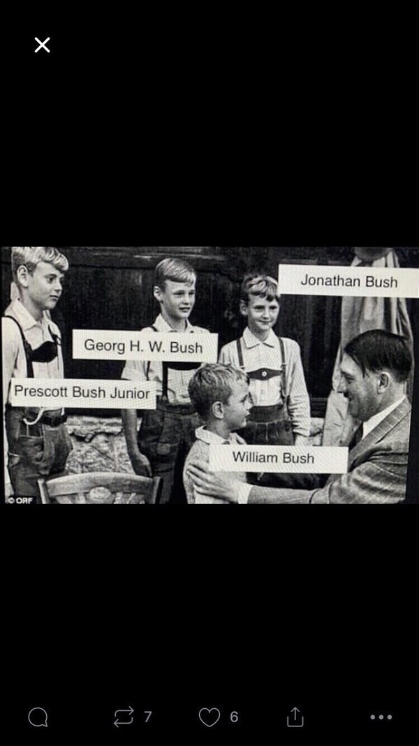 Adolph Hitler’s with Jonathan Bush, Georg H. W. Bush, Prescott Bush Junior, William Bush. Obama’s mother is a product of a fling between Hitler and the housekeeper in Argentina. That means Obama is Hitler’s grandson.