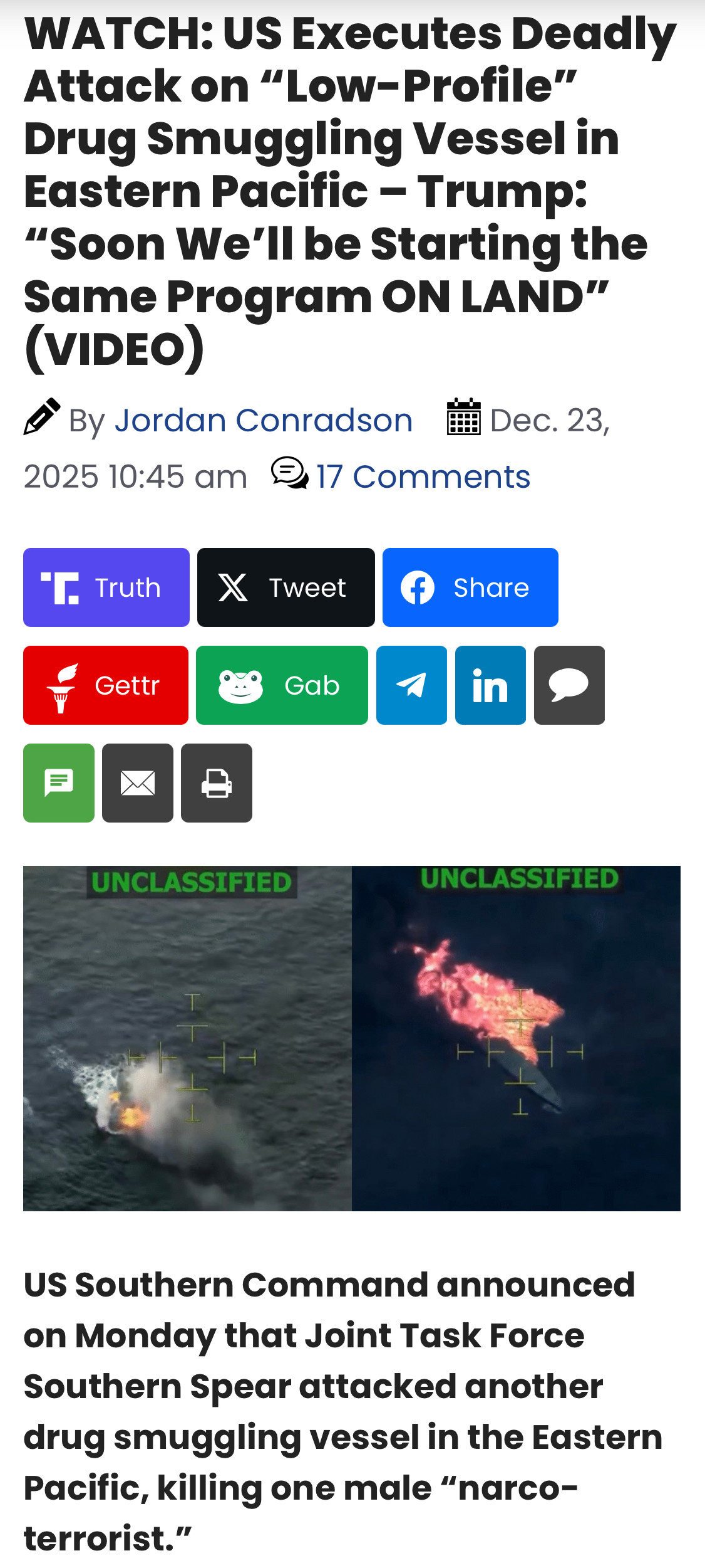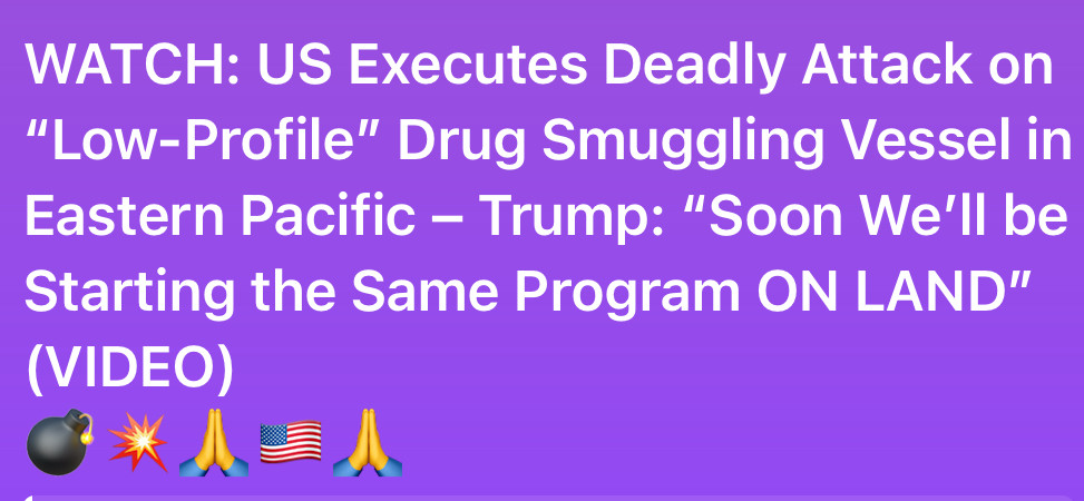 US Executes Deadly Attack on “Low-Profile” Drug Smuggling Vessel in Eastern Pacific – Trump: “Soon We’ll be Starting the Same Program ON LAND”