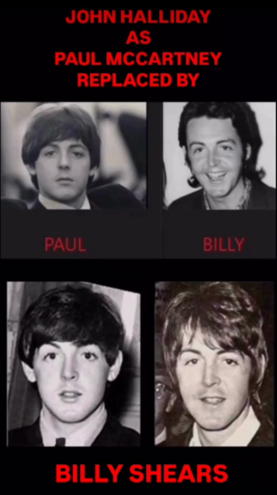THIS RABBIT HOLE RUNS DEEP - JOHN HALLIDAY WAS THE ORIGINAL PAUL MCCARTNEY THEN WAS WRITTEN OUT OF THE SCRIPT AND REPLACED WITH BILLY SHEARS. BILLY MARRIED LINDA EASTMAN AND LIVED