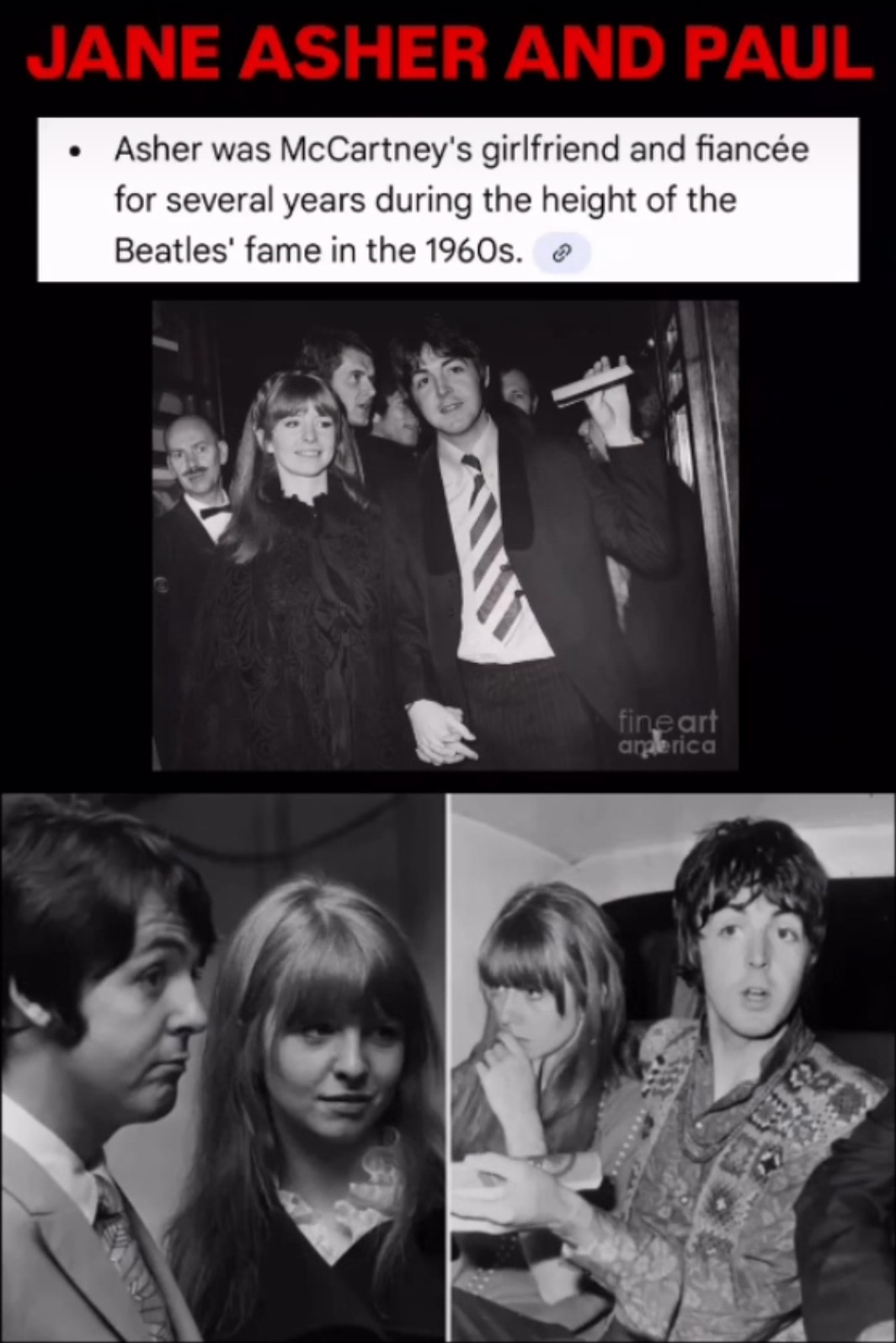 • Asher was McCartney’s girlfriend and fiancée for several years during the height of the Beatles’ fame in the 1960s. THE Sun THE FAB FOUR NOW THREE