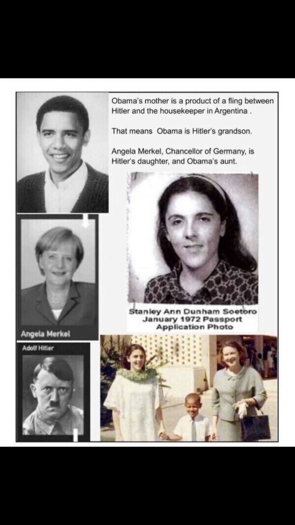 Angela Merkel, Chancellor of Germany, is Hitler’s daughter, and Obama’s aunt.