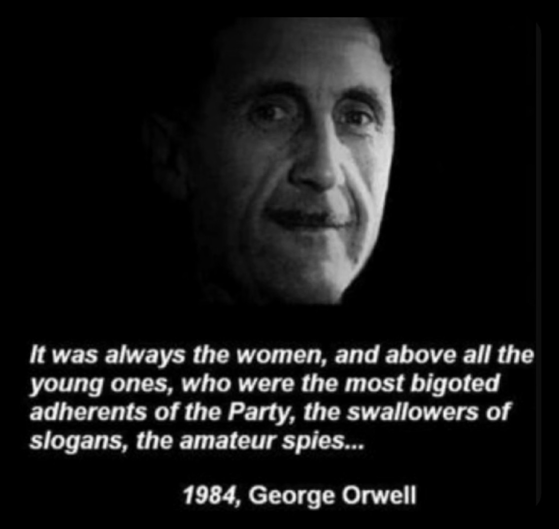 It was always the women, and above all the young ones, who were the most bigoted adherents of the Party, the swallowers of slogans, the amateur spies.... 1984, George Orwell. Brainwashed white liberal women weaponized to destroy themselves and everything around them.
