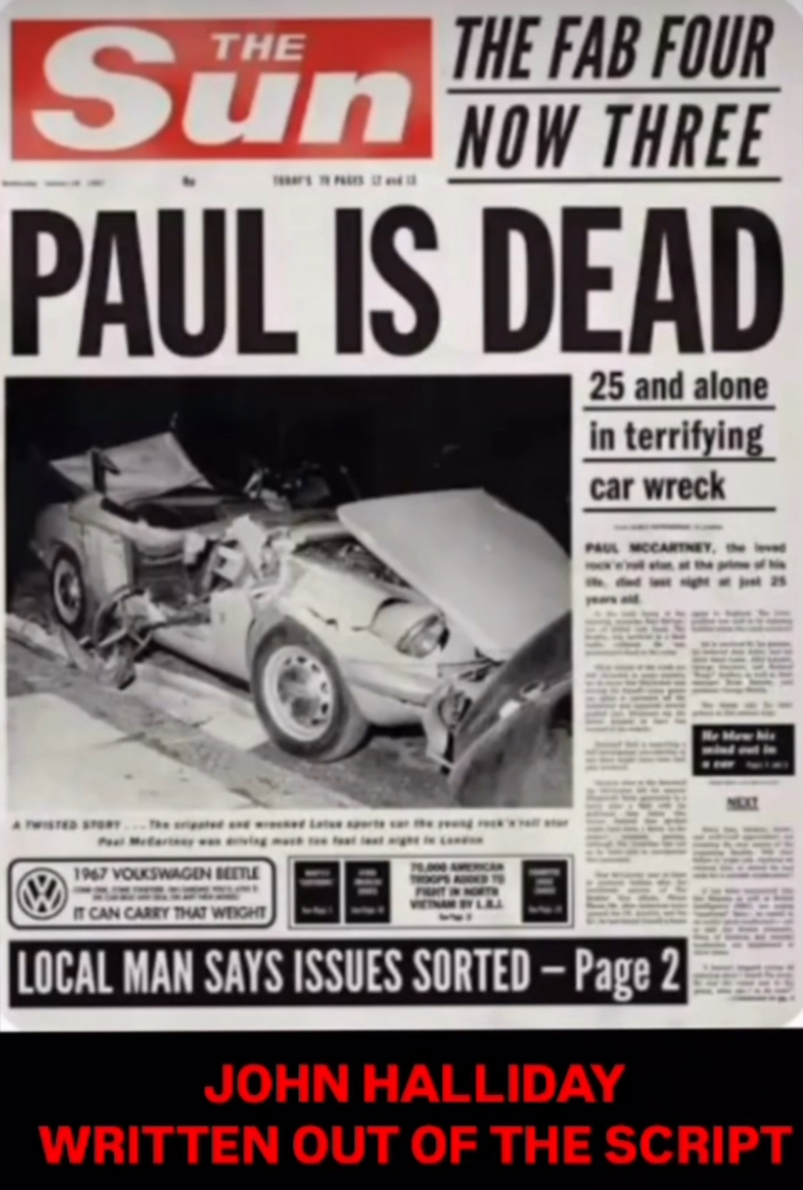 PAUL IS DEAD 25 and alone in terrifying car wreck. JOHN HALLIDAY AS PAUL MCCARTNEY REPLACED BY