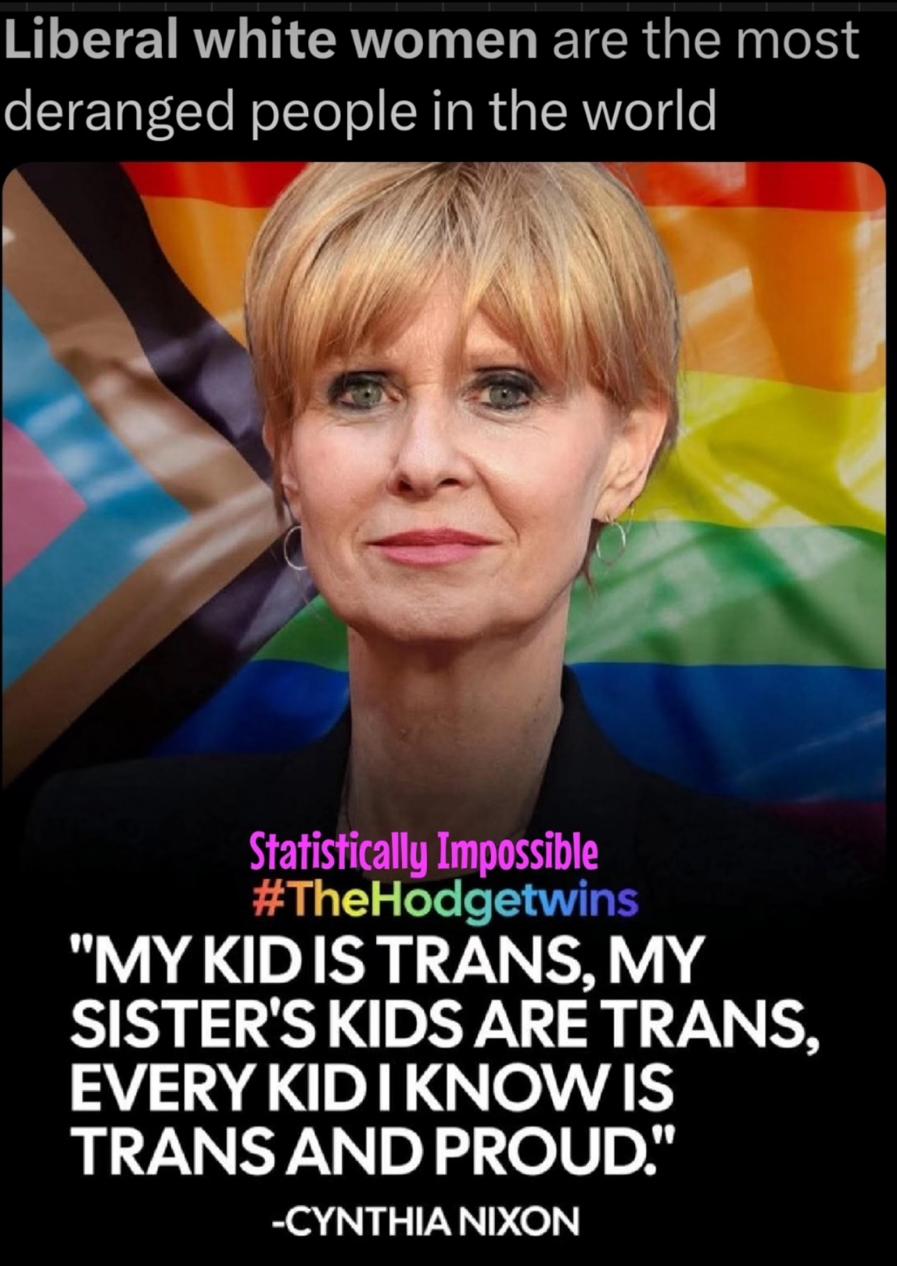 -CYNTHIA NIXON You don’t even have to be born female. Logic dissipates in those who feel they have superior levels of