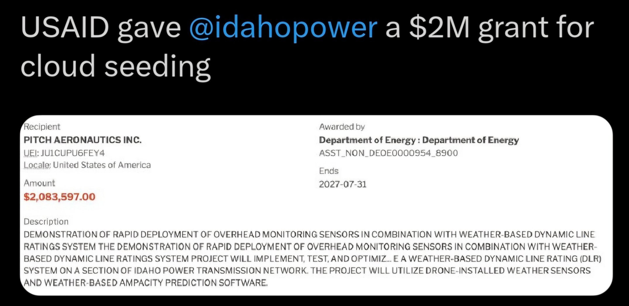 USAID funds chemtrails. 2 million was paid for Idaho citizens to have heavy metal toxins sprayed on them and they're paid for up until 2027. That's just 1 state. How much for the other states? 🤔😡 Congress approved a 5 yr plan so all spraying is bought and paid until 2027. Um no