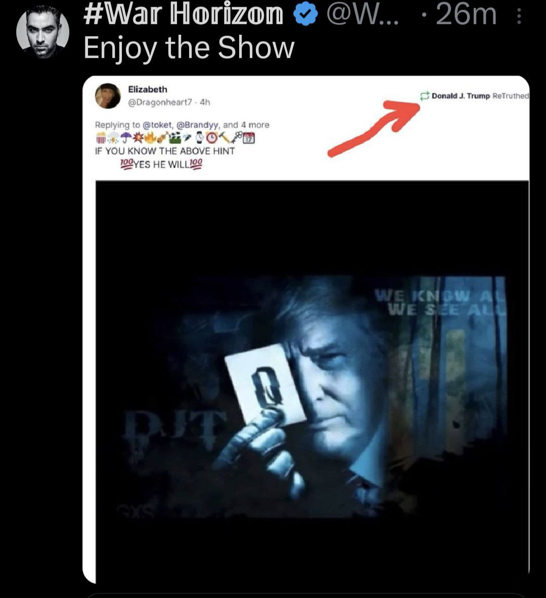 Trump is reposting this, and the central element is him with the Q card ...