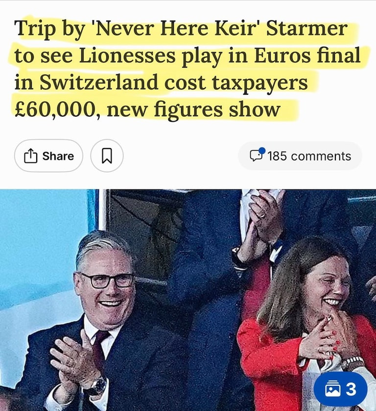 🇬🇧 Treasonous Globalist Tyrant Starmer wasted £60,000 of tax payers funds taking a private jet to watch the Lionesses Euros final.
