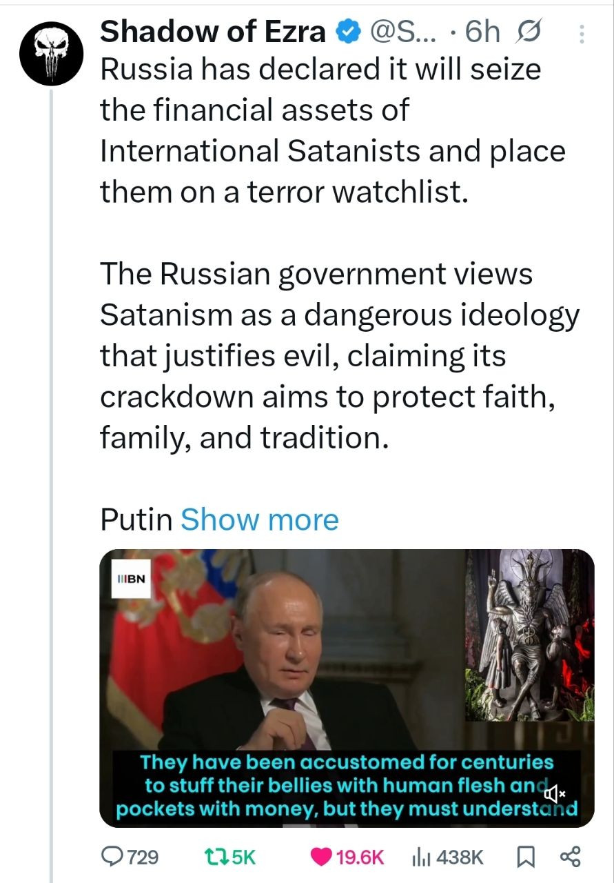 Russia has declared it will seize the financial assets of International Satanists and place them on a terror watchlist.
