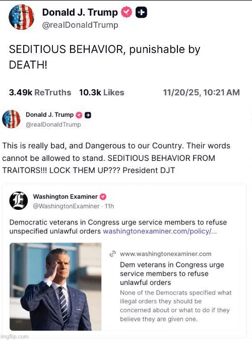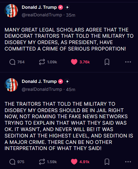 Trump calls for the traitorous Dems to be locked up for urging service members and the intelligence community to disobey orders from POTUS.