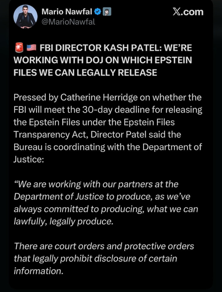 Maybe just redact the victim names and release everything possible in accordance with the law? This crook needs fired and Kash and Bongino need to recognize that the Bill Barr 2.0 DOJ isn't going to last as it is. We the people are sick of the games and if they screw up this release it will cost the midterms and their jobs.