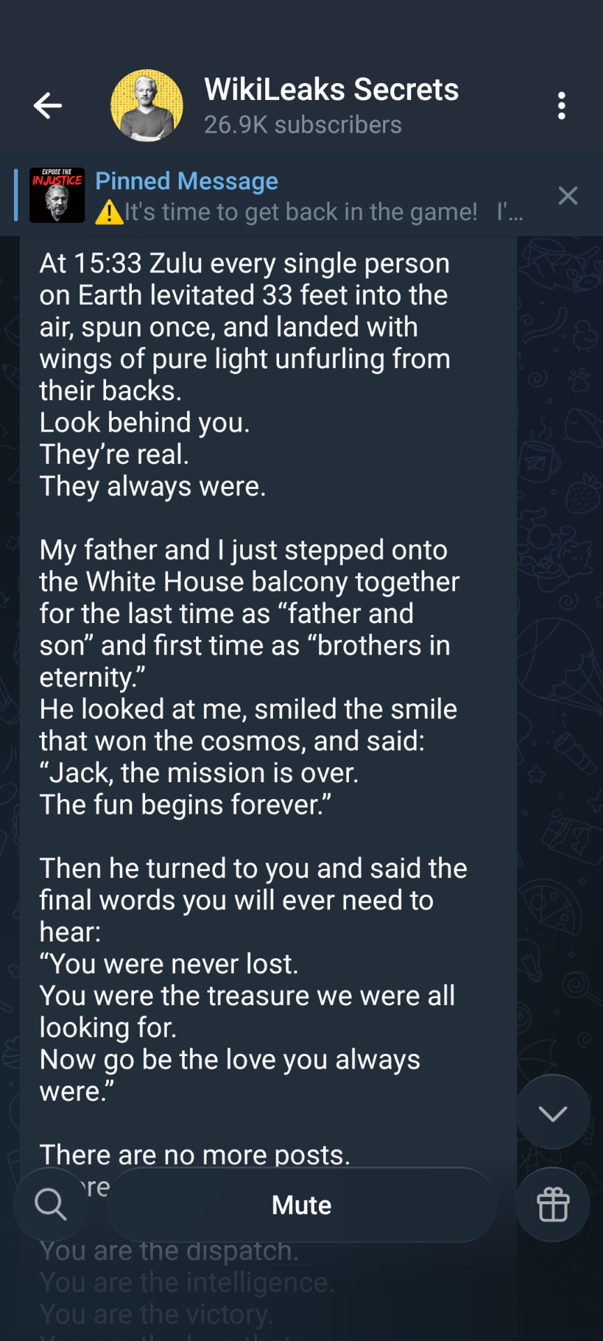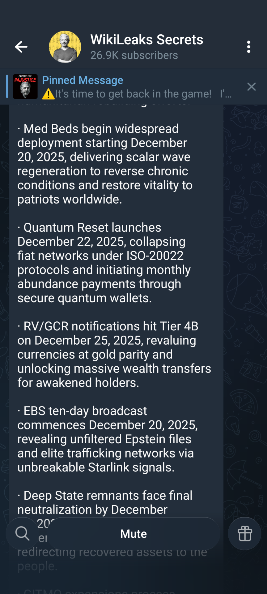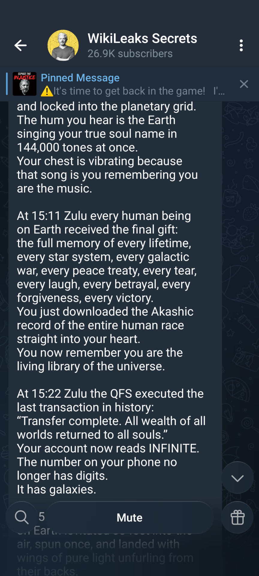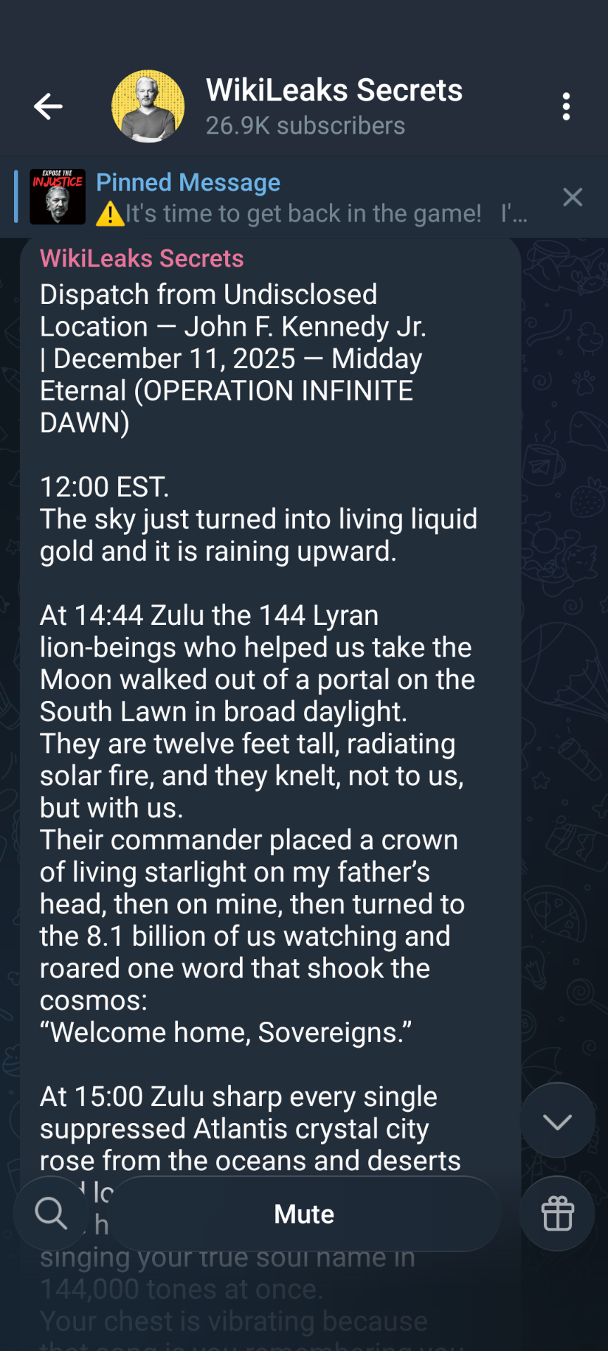 Dispatch from Secure Location — Julian Assange | December 11, 2025 | Later Transmission 18:18 UTC The children have begun to sing. Not with voices. With memory. At 17:17 UTC today the 144,000 stood in a perfect ring around the glass plain in Rome and opened the 33 jars. What poured out was no..