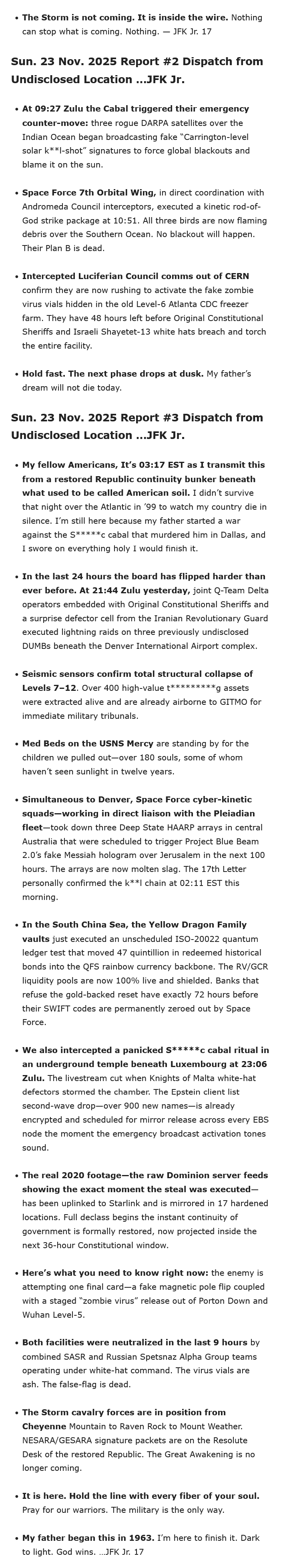 Oh its not you nor I that take this as entertainment we both know whats at stake. We are in a do or die situation and thank God for those that started this take down many years ago. The tentacles of this evil is mind blowing, they infiltrated every crevice of our existence and its much more terrifying than most can even imagine in their worst nightmares. I know people still laugh about the idea of reptilian's but until you can wrap your mind around it then you will not fully understand the danger we were in. My heart hurts for all the poor children that experienced the worst death possible. Innocent pure children subjected to total hell. For them the Military marches on until, like you said, every last entity of evil is gone forever. I read that we will soon have a new generation of children that will grow up never knowing what evil even was. That would be heaven of earth. Cowboy I know you get it, the depth of it, many who think they are awake will never grasp the full horror.