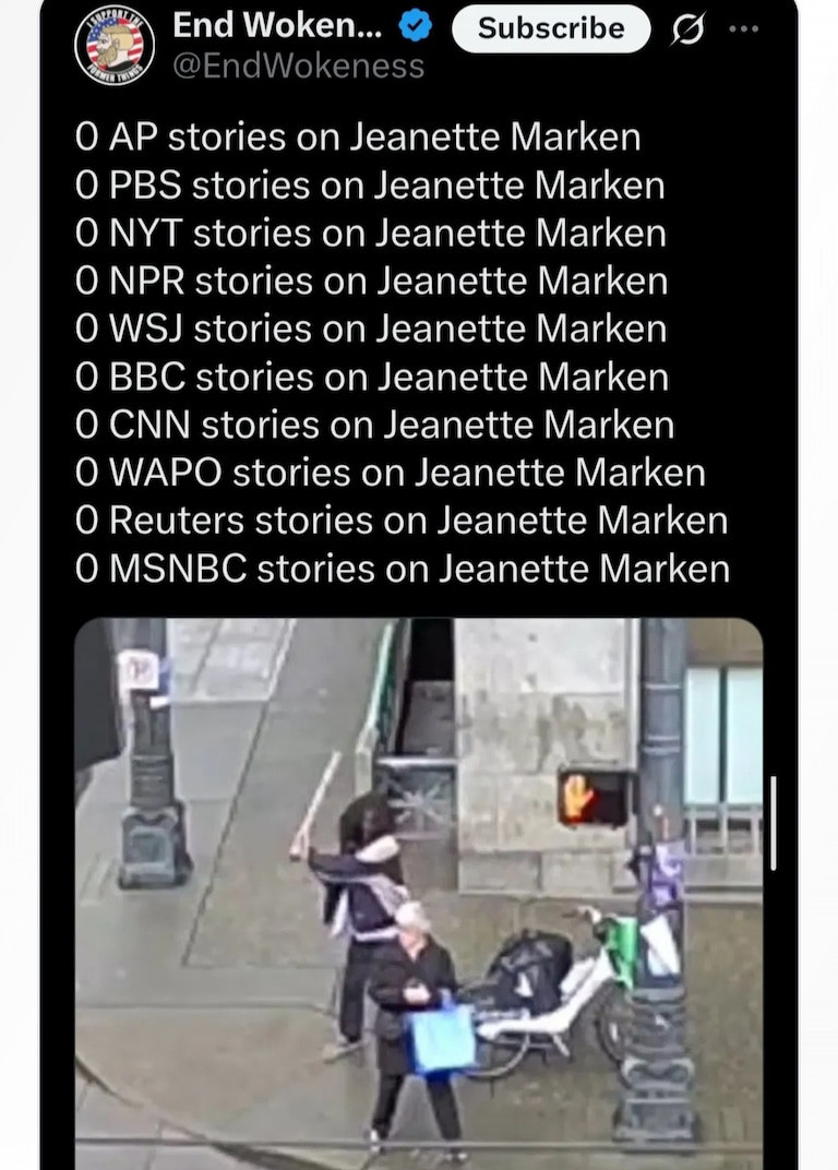 Yesterday an assailant swung a wooden board with a screw in it at Jeanette Marken, gouging out her eye in a savage & unprovoked attack. What is equally disturbing is MSM's refusal to even mention it.
