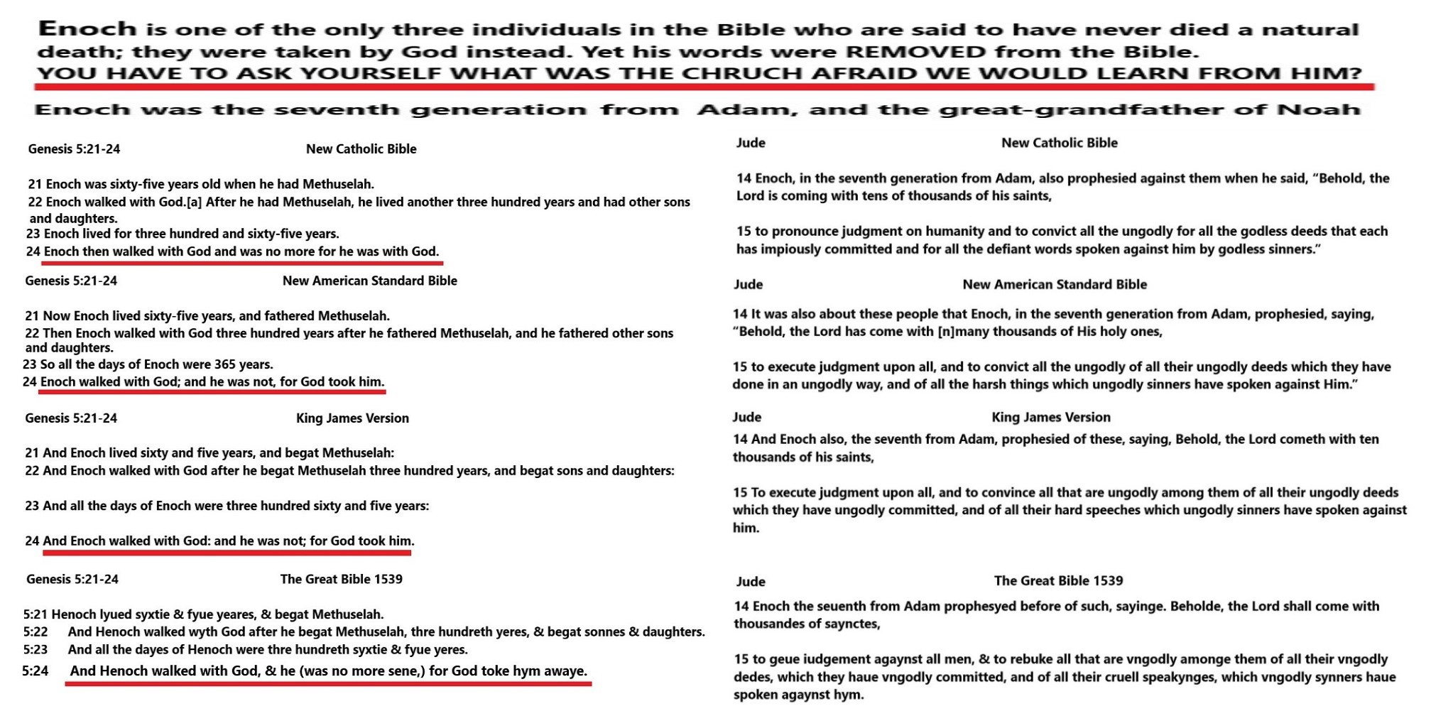 Enoch was one of only three individuals in the Bible who are said to have never died a natural death; they were taken by God instead. Yet his words were REMOVED from the Bible, YOU HAVE TO ASK YOURSELF, WHAT WAS THE CHRUCH AFRAID WE WOULD LEARN FROM HIM?