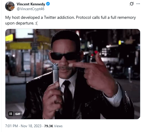 My host developed a Twitter addiction. Protocol calls full a full rememory upon departure. :(