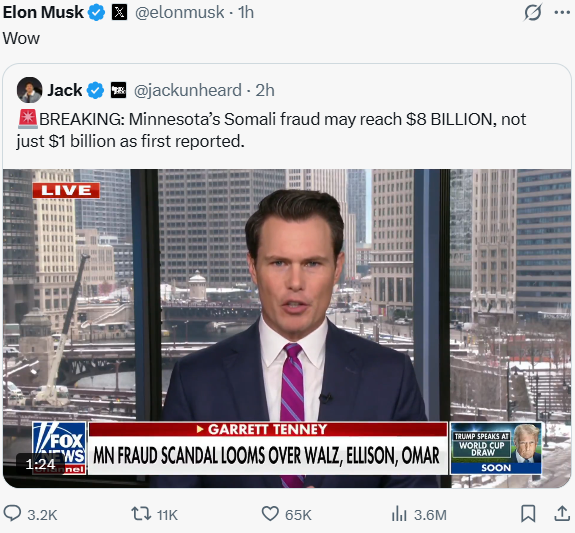 Stephen Miller says we’ve just scratched the surface of the fraud in Minnesota and the state government is fully complicit in it and that the unfolding federal probe into Somali welfare fraud in Minnesota may expose the largest taxpayer theft in U.S. history: