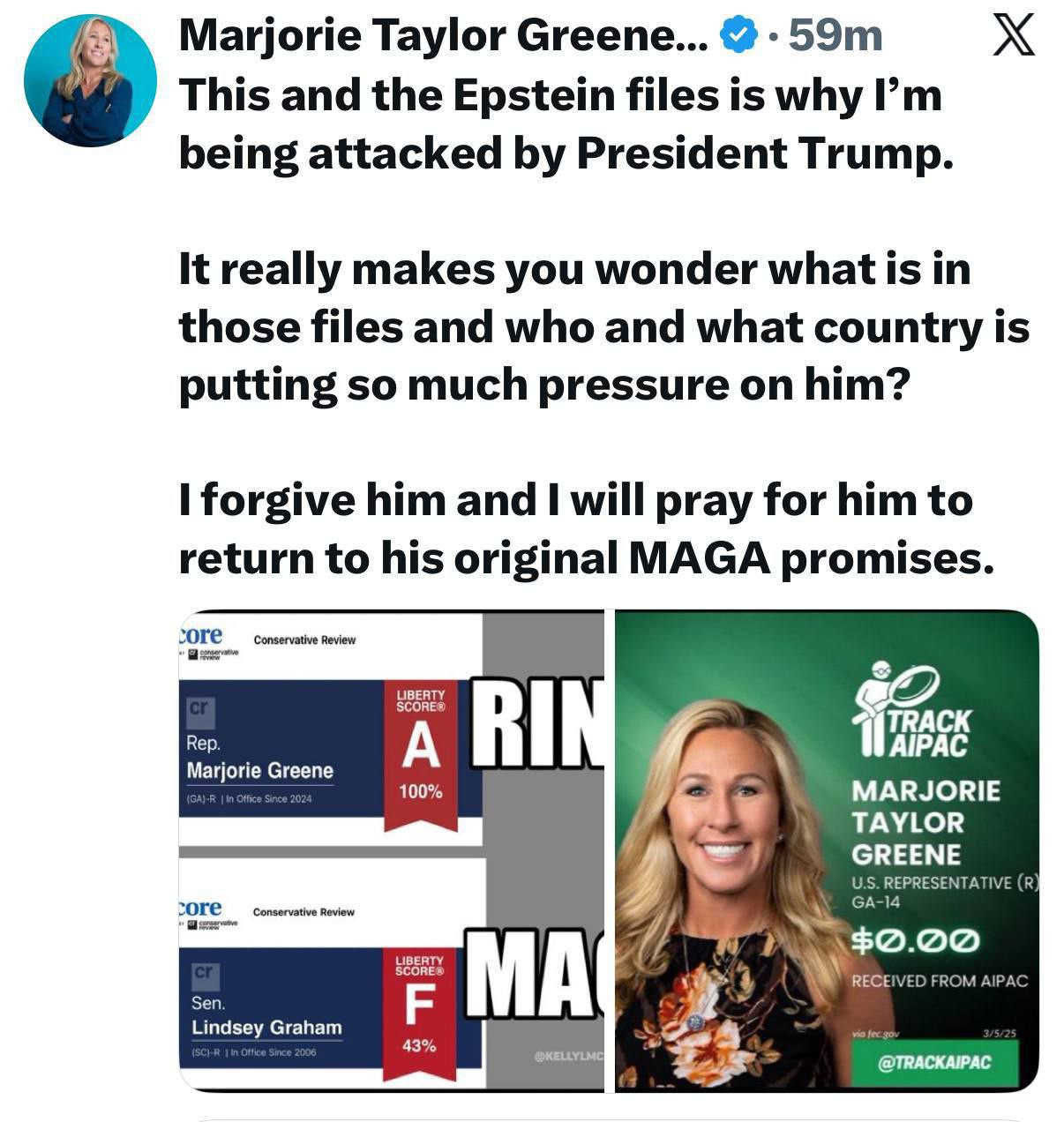 Marjorie is just part of the plan to make more people that are against Trump expose those files and when they are exposed they'll find out all the Democrats and some of the Republicans that were involved in the Epstein files but not Trump we're already all know that.