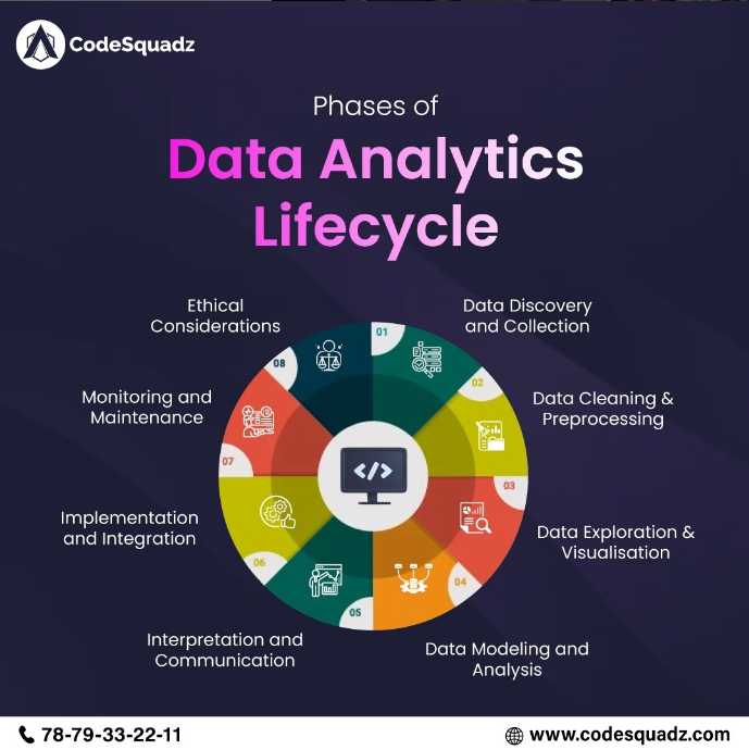 The Phases of the Data Analytics Lifecycle in a circular flowchart. It highlights key stages such as Data Collection, Cleaning, Exploration, Modeling, Interpretation, and Maintenance. Each phase is visually represented with icons and distinct colors, emphasizing a structured and ethical approach to data analytics.