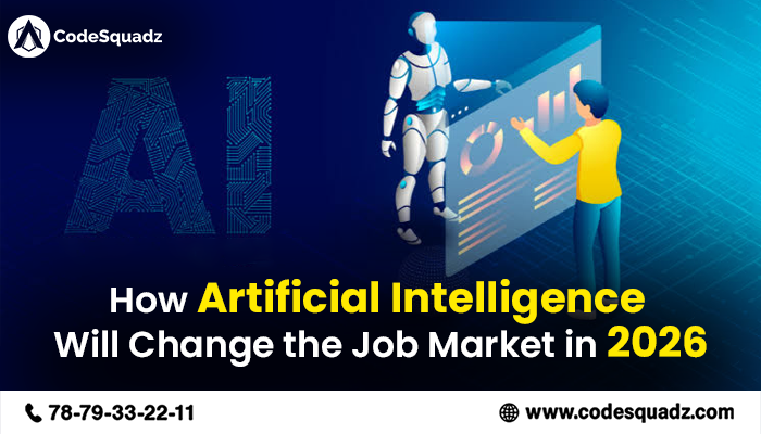 Artificial Intelligence will reshape the global job market by 2026. Featuring a human interacting with an AI robot, the visual represents automation, smart technologies, and the future of work. Ideal for tech blogs, AI discussions, and career development platforms. Perfect for highlighting CodeSquadz’s commitment to future-ready IT training.