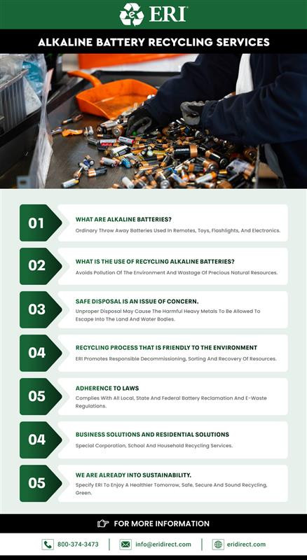 Promote a cleaner, safer environment with ERI’s trusted Alkaline Battery Recycling Services. This infographic highlights the importance of recycling used batteries, preventing pollution, and complying with environmental regulations. Discover how ERI helps businesses and homes dispose of batteries responsibly.