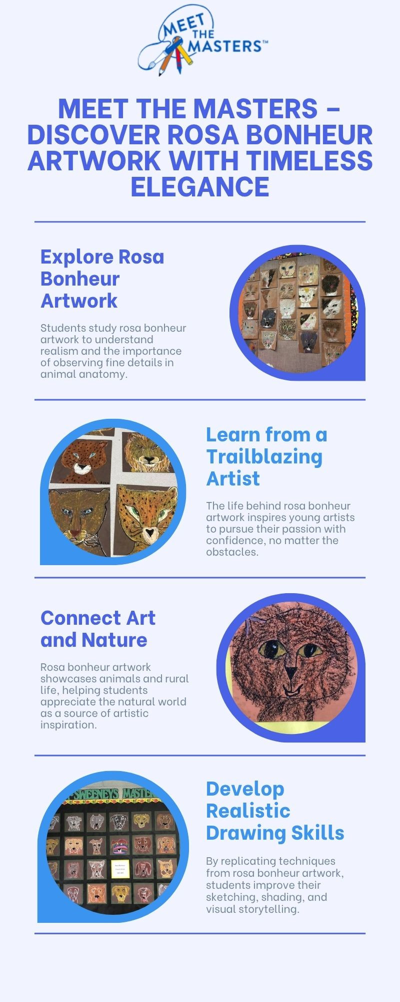 Meet the Masters brings Rosa Bonheur's artwork to life, showcasing her mastery in realistic animal paintings. They inspire art lovers to learn and appreciate her legacy through their engaging educational programs.
