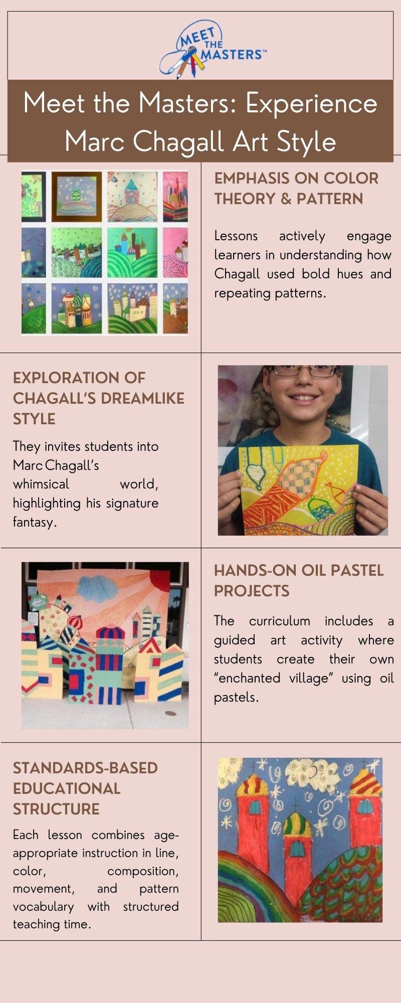 Meet the Masters helps students explore the magical Marc Chagall art style through fun and easy art lessons. Known for his bright colors and dream-like pictures, Chagall’s artwork inspires creativity and imagination. With step-by-step instructions, Meet the Masters makes it simple for teachers and parents to guide kids in making their own standards-based, art history Chagall-style art.