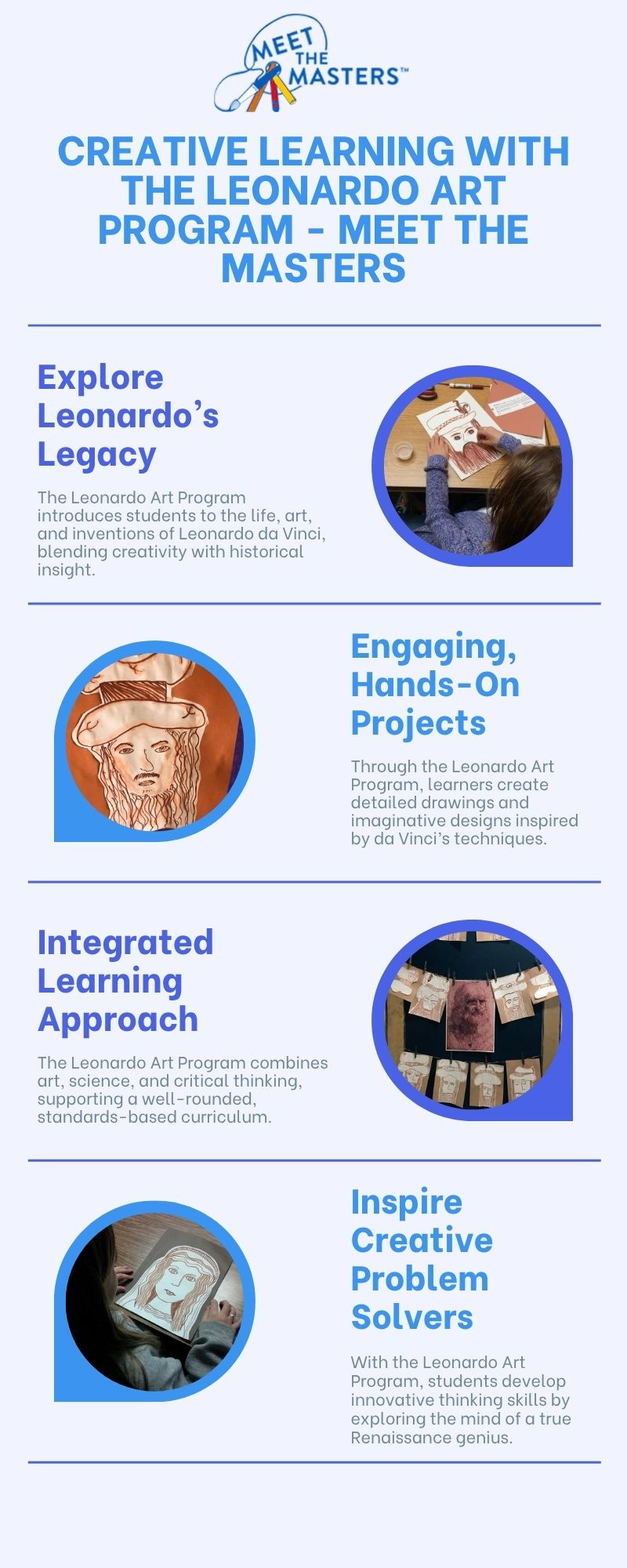 Meet The Masters presents the Leonardo Art Program, designed to immerse students in the genius of Leonardo da Vinci. They offer comprehensive lessons that explore his techniques and innovations, encouraging creativity and a deeper understanding of Leonardo's contributions to art and science.