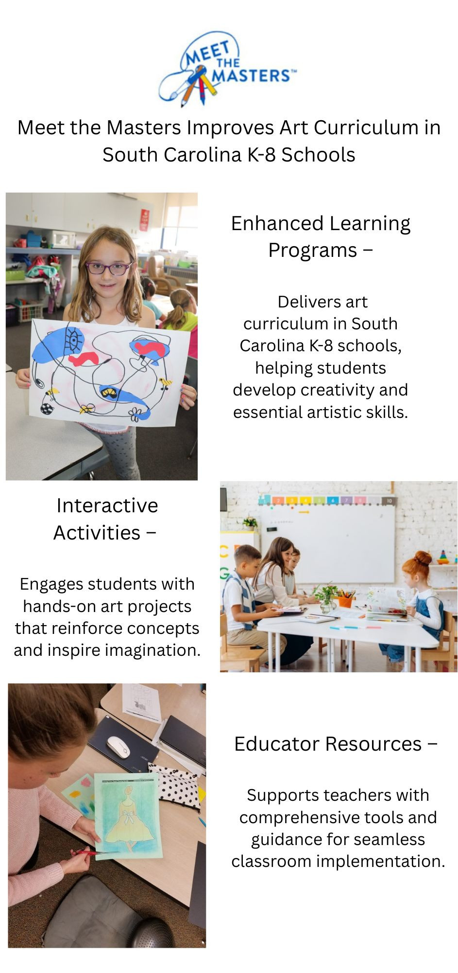 Meet the Masters provides art curriculum in South Carolina K-8 schools, combining practical instruction with creative projects that enhance students’ artistic skills, visual literacy, and self-expression. Their program equips teachers with structured, engaging content that complements school curricula, enabling students to explore diverse art forms, develop critical thinking, and foster a lasting appreciation for the arts. Schools gain a comprehensive, flexible solution for art education across grade levels.