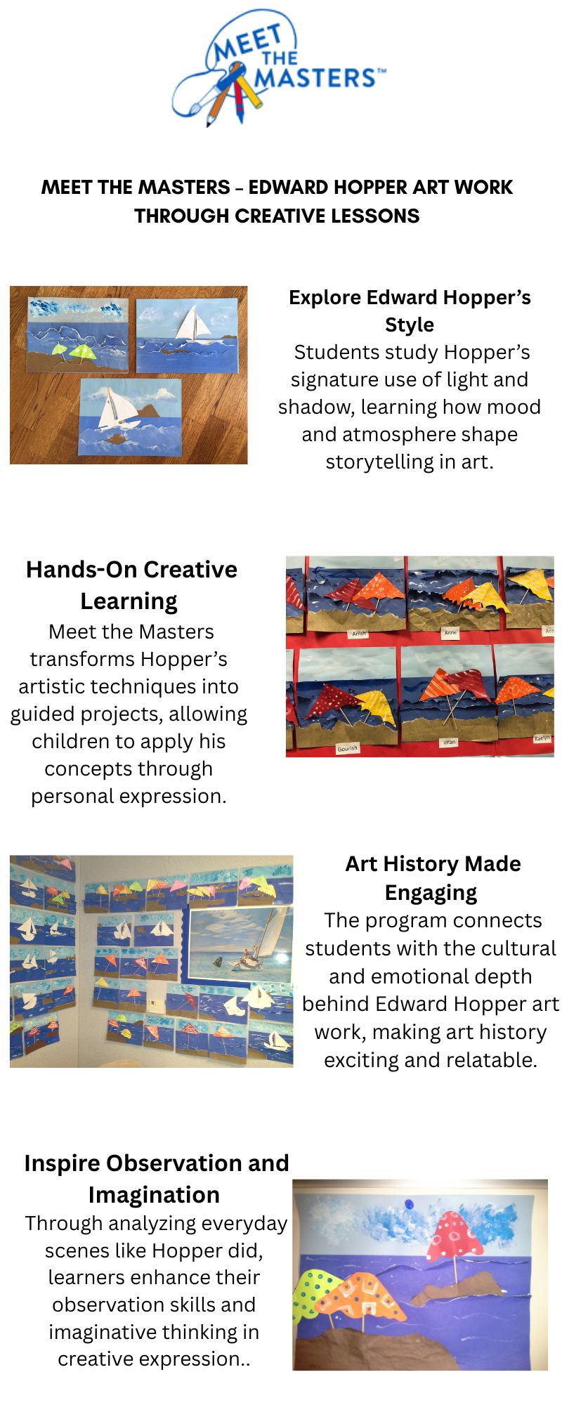 Meet The Masters highlights the benefits of arts in schools by engaging students in structured visual learning, creative projects, and classroom discussion. Programs support critical thinking, communication, cultural awareness, and problem-solving skills. The lessons reinforce personal development and academic growth while encouraging curiosity, observation, and a lifelong appreciation for artistic practice.
