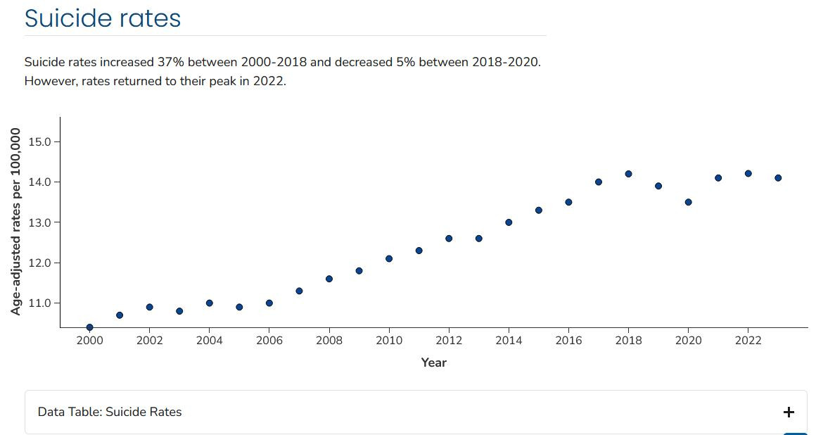 "After increasing between 2001 (10.7) and 2018 (14.2), the age-adjusted suicide rate declined for 2 years through 2020 (13.5), and then increased to 14.1 in 2021.