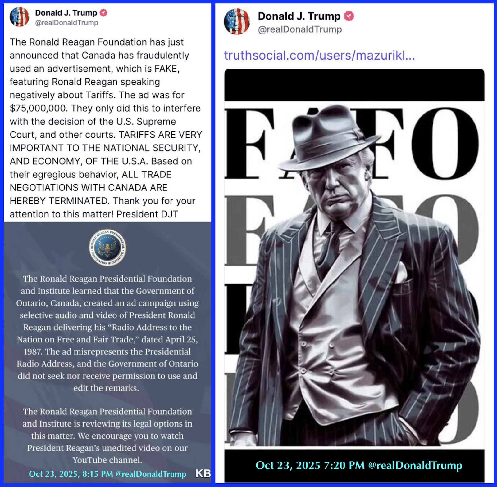 CANADA CHEATED AND GOT CAUGHT!!!They fraudulently took a big buy ad saying that Ronald Reagan did not like Tariffs, when actually he LOVED TARIFFS FOR OUR COUNTRY, AND ITS NATIONAL SECURITY. Canada is trying to illegally influence the United States Supreme Court in one of the most important rulings in the history of our Country. Canada has long cheated on Tariffs, charging our farmers as much as 400%. Now they, and other countries, can’t take advantage of the U.S. any longer. Thank you to the Ronald Reagan Foundation for exposing this FRAUD. MAKE AMERICA GREAT AGAIN!!!