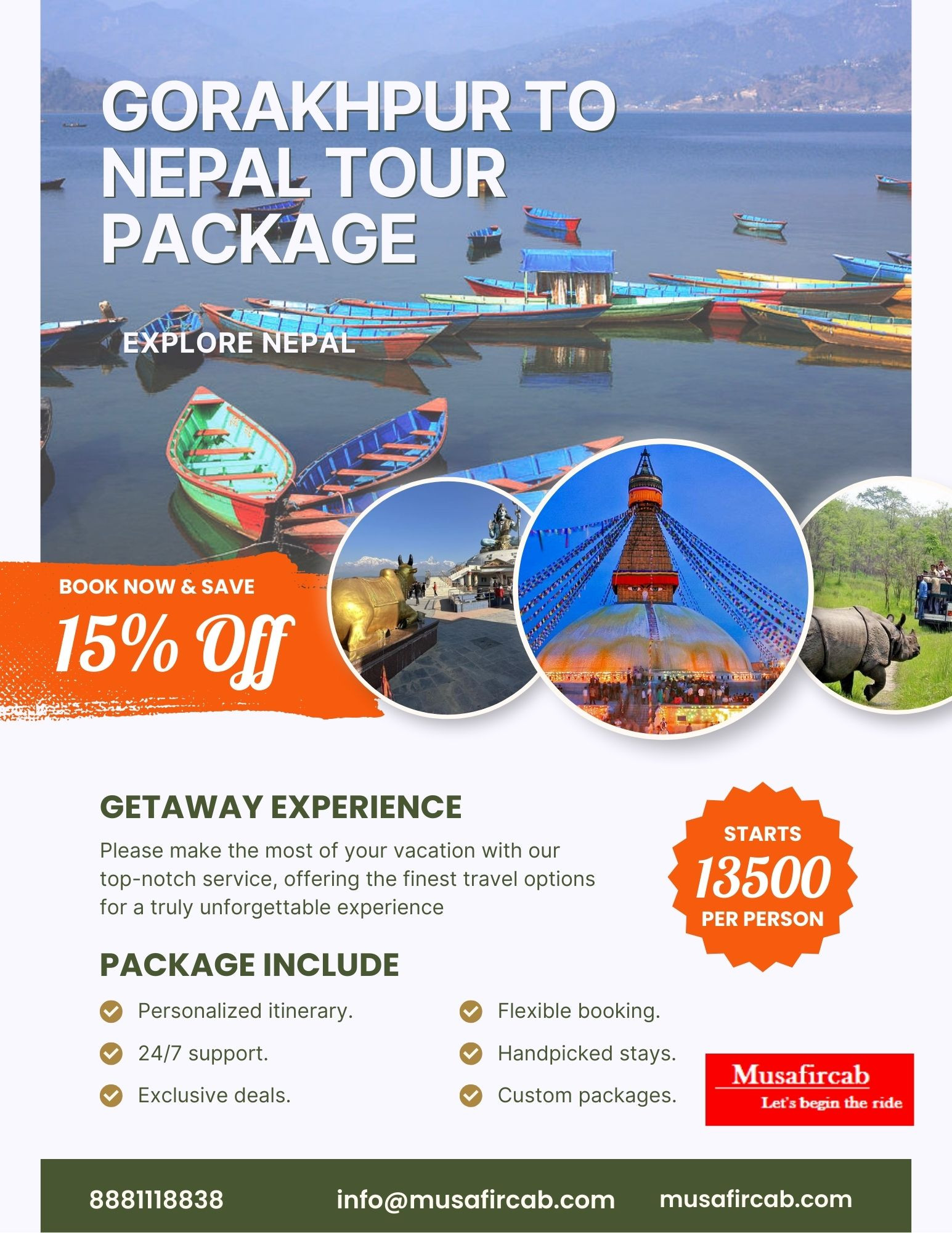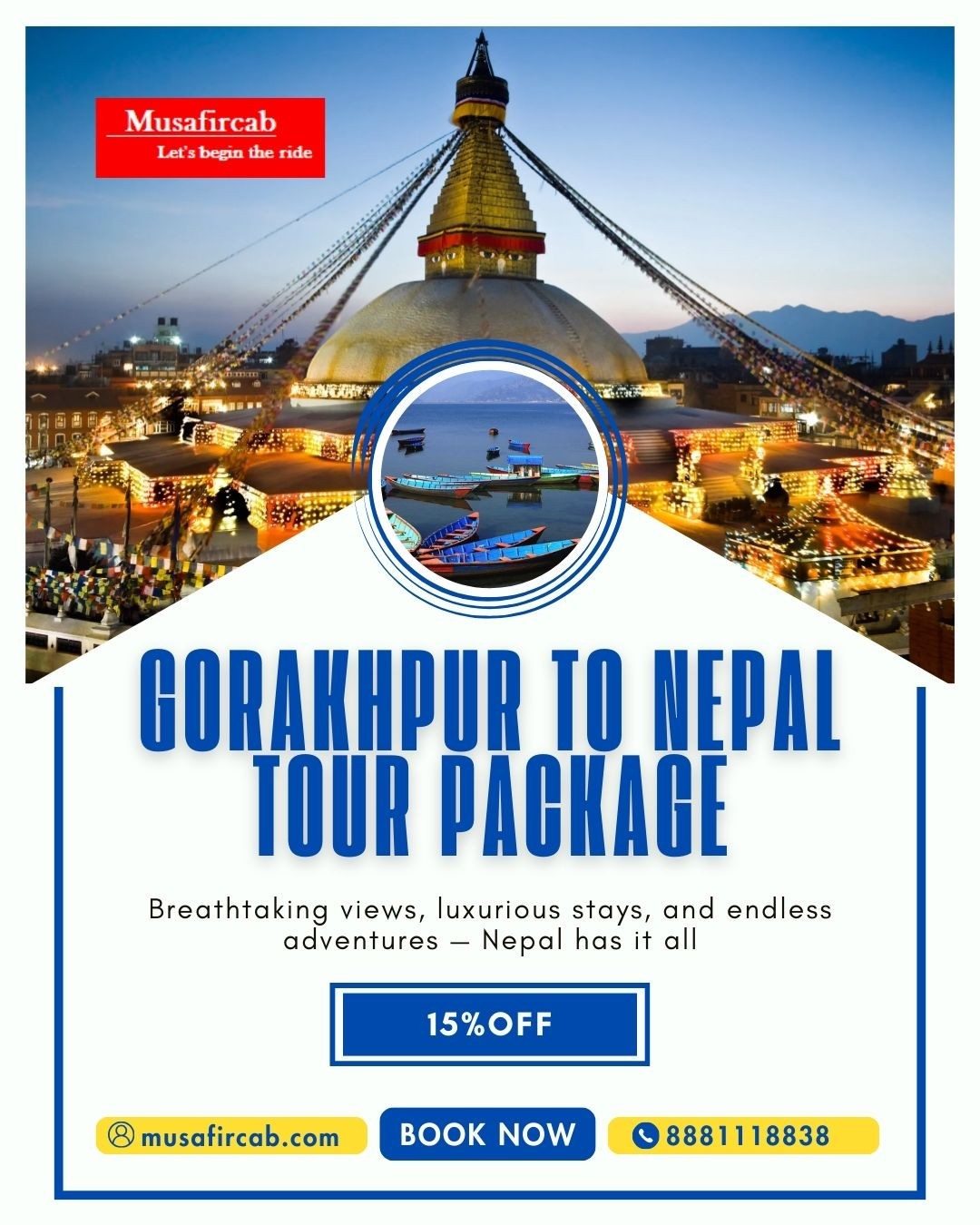 Embark on a magical journey from Gorakhpur to the serene landscapes and vibrant culture of Nepal with our exclusive Nepal Tour Package by Musafircab. Designed for those seeking spiritual peace, cultural richness, and breathtaking adventure, this package covers all the essentials for a perfect getaway.
