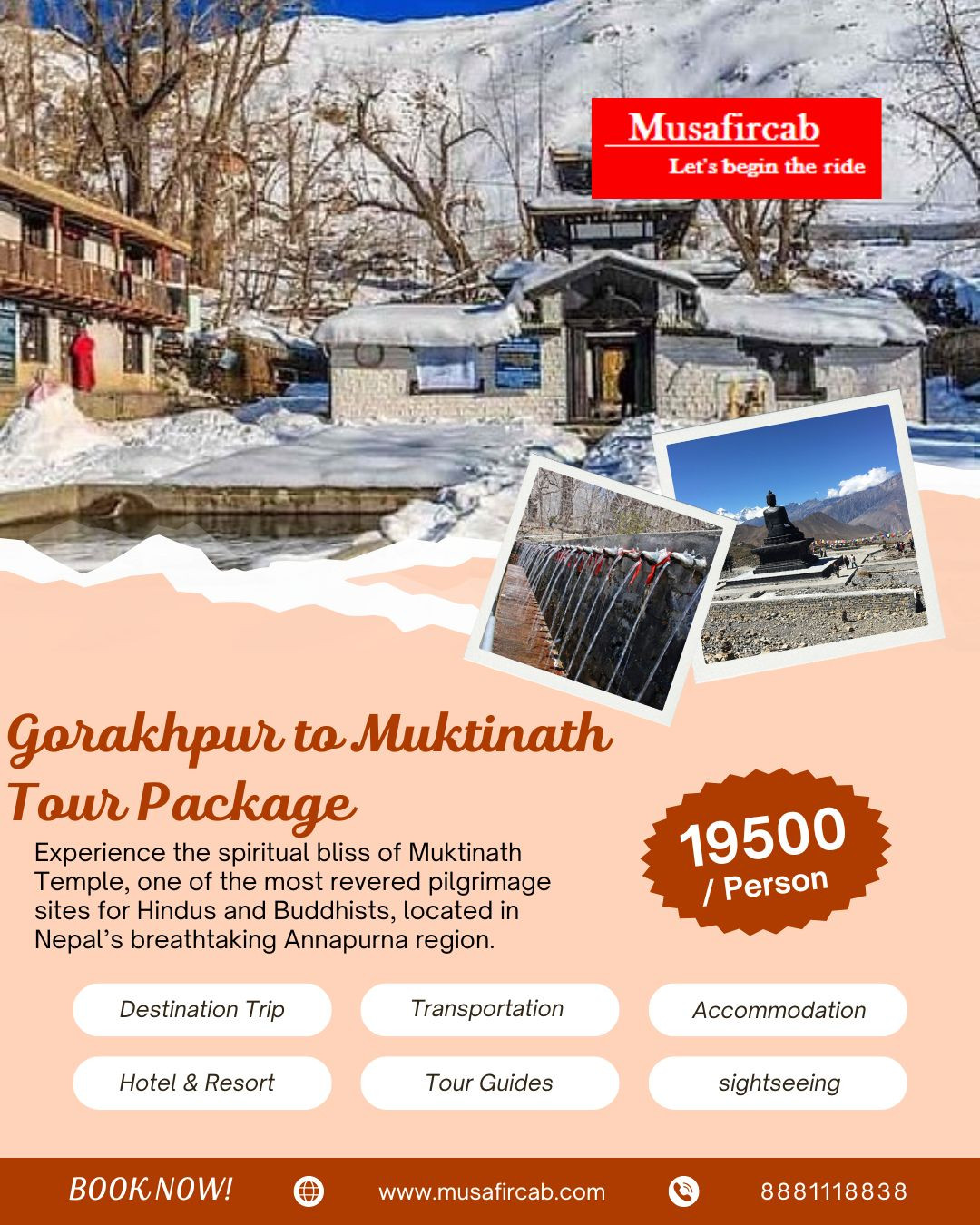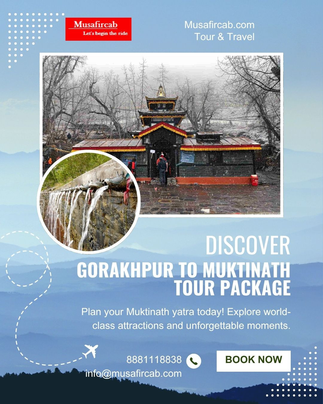 Looking for a soul-refreshing trip? Join our Gorakhpur to Muktinath Tour Package with Musafircab β a perfect blend of spirituality, adventure, and natural beauty. Whether youβre seeking spiritual liberation or a scenic adventure, Muktinath will leave an indelible mark on your soul. Muktinath offers a rare blend of spiritual sanctity and scenic splendour, making it a perfect destination for those seeking both inner peace and breathtaking adventure.