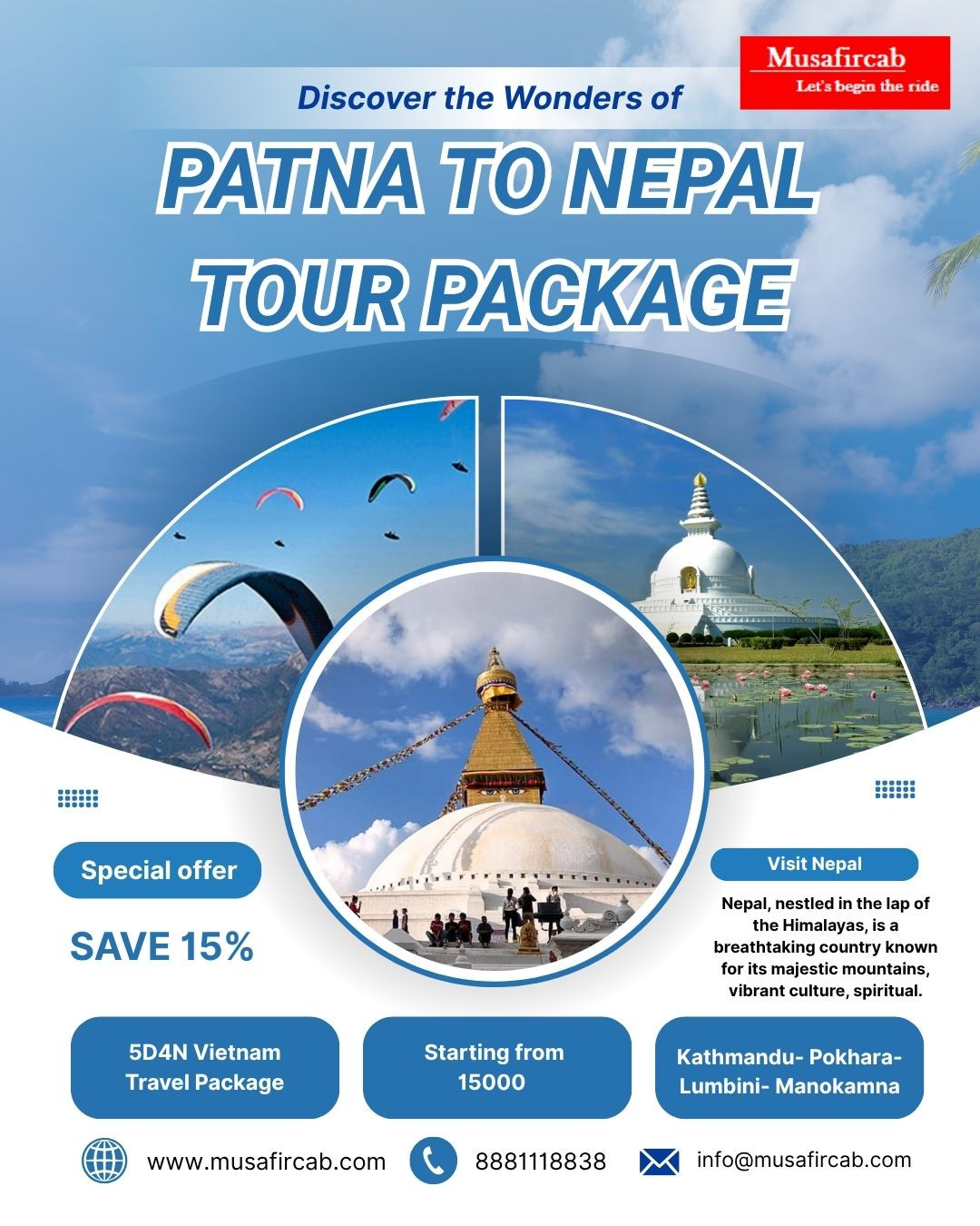 If you're planning a trip to Nepal from Patna, Musafircab offers affordable and fully customizable Nepal Tour Packages designed to fit every budget. Whether youβre looking for a peaceful retreat or a fun-filled adventure, we ensure a safe, comfortable, and unforgettable journey.