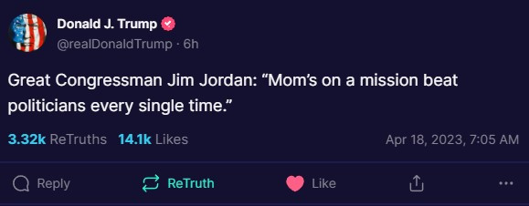 Great Congressman Jim Jordan: “Mom’s on a mission beat politicians every single time.” https://truthsocial.com/us...