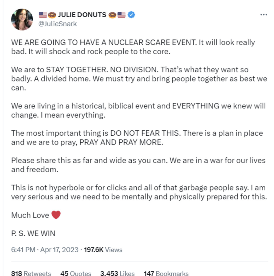 We’ve past the point that I can’t share this stuff with others as too many of these “events” never happen & tired of looking stupid. Anything major that could happen before this could validate some truth to it, but until then people will just call it more fear porn.