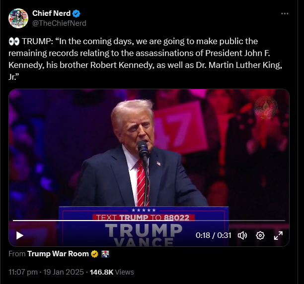 TRUMP: “In the coming days, we are going to make public the remaining records relating to the assassinations of President John F. Kennedy, his brother Robert Kennedy, as well as Dr. Martin Luther King, Jr”