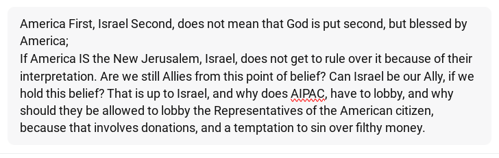 and our C.I.A. (?) thus you have AIPAC money, and the race card surfaces again to protect those discriminated against, so that they can take power in America, as the Democrats played the race card to gain power.