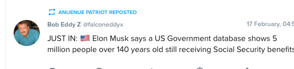 JUST IN: 🇺🇸 Elon Musk says a US Government database shows 5 million people over 140 years old still receiving Social Security benefits.