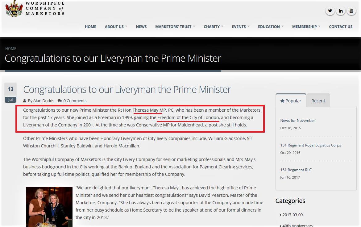 Congratulations to our new Prime Minister the Rt Hon Theresa May MP, PC, who has been a member of the Marketors for the past 17 years.