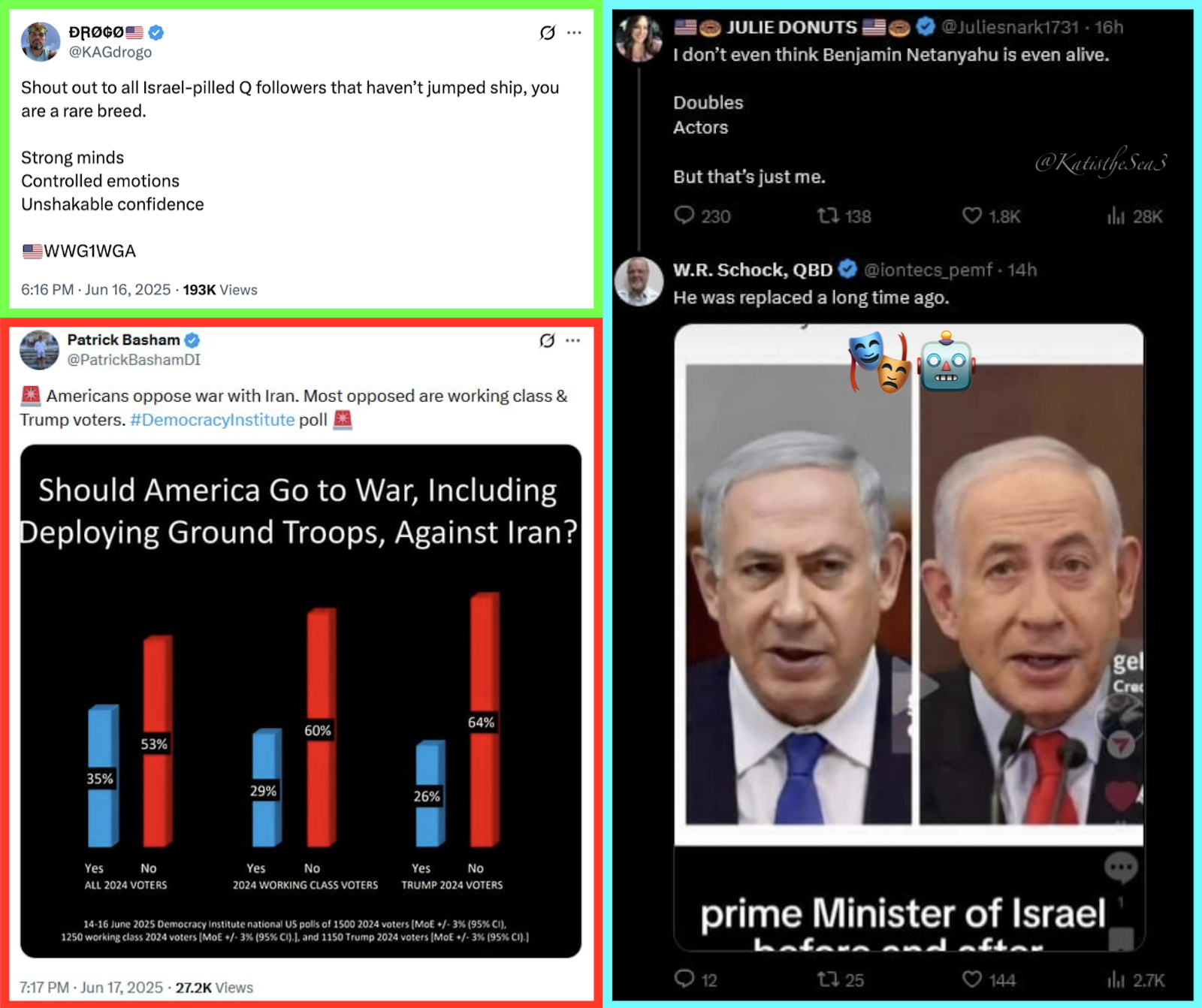 POTUS will NOT send any American troops to that bizarre war in Israel. The evil leader(s) of both Iran and Israel can NOT stop the floodgates of TRUTH about to be unleashed upon all the earth. They are only inflicting death and harm to their own citizens who do not deserve that. Prayers for all the innocent people who are in harms' way.