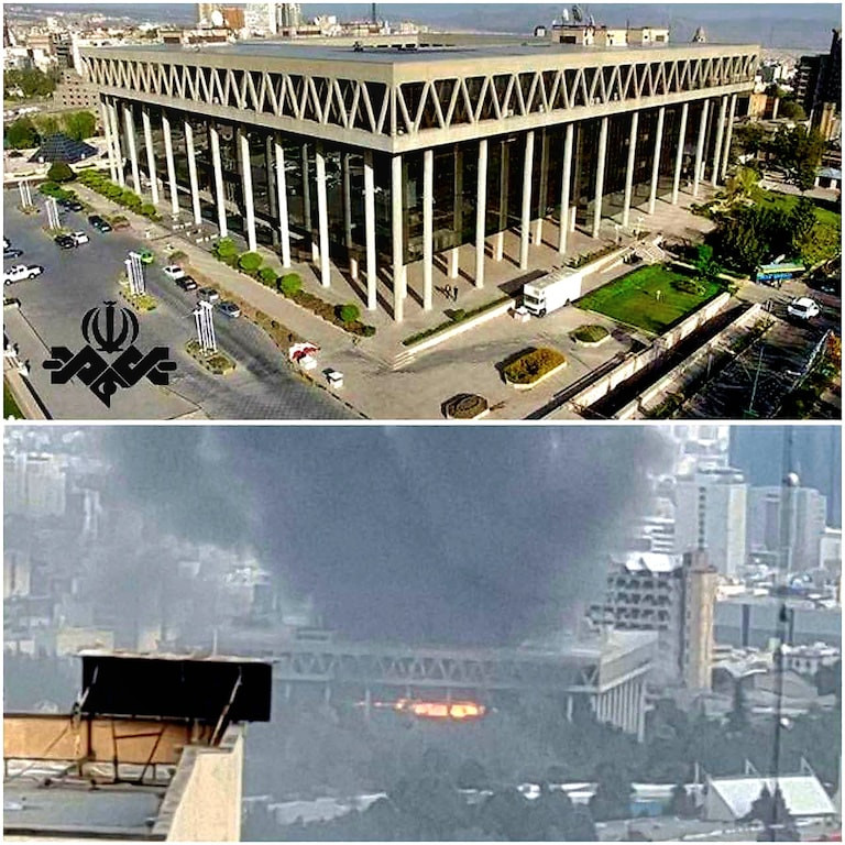 This is not a barbecue or commercial break, it's the Iranian TV building before and after.