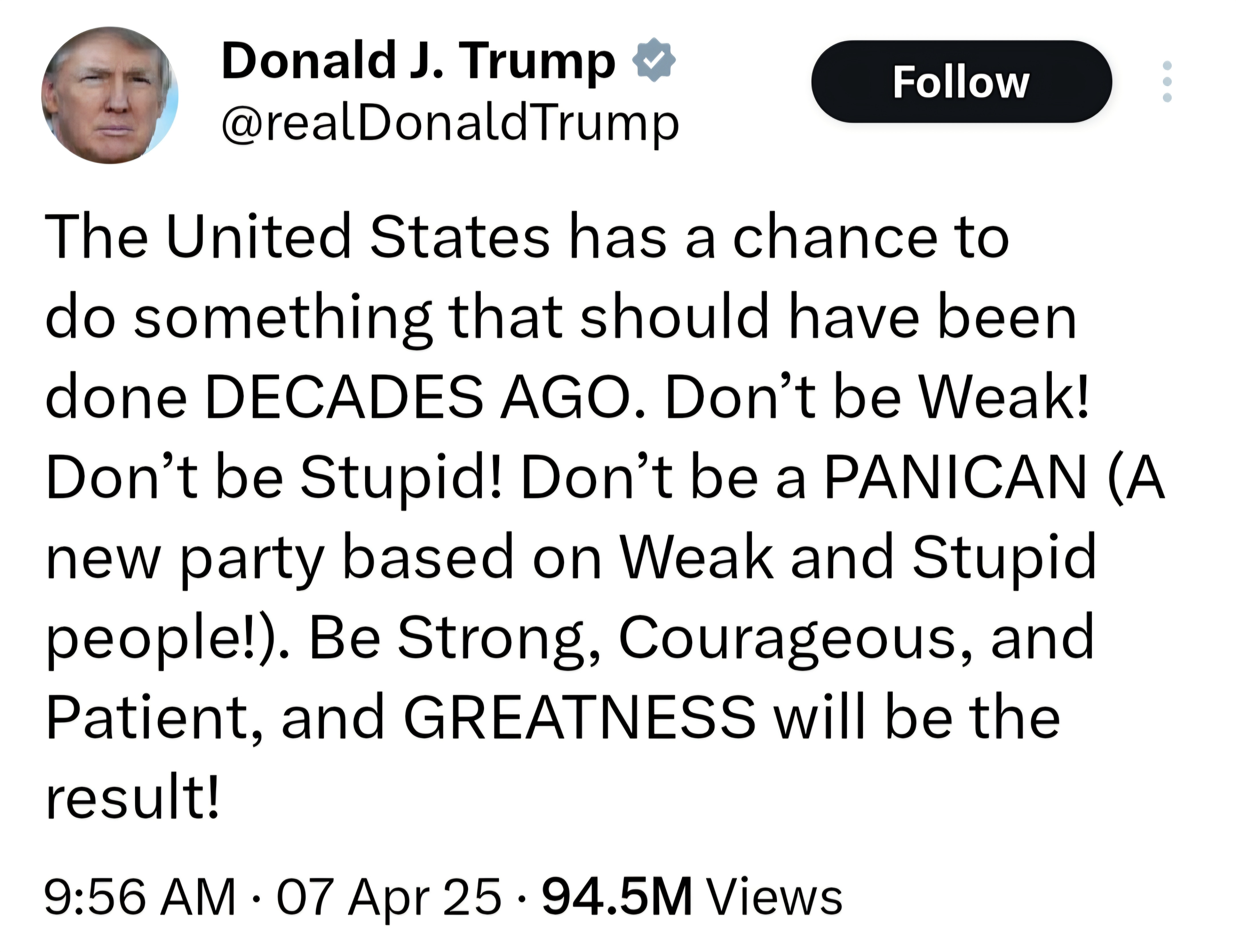 Trump posted the word PANICAN on Truth Social on April 7, 2025. I interpreted it to be the words Panic and American combined to create a Portmanteau.