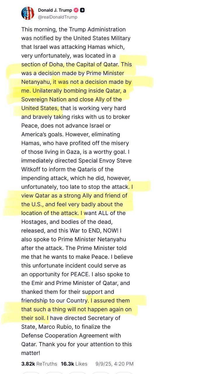 “This was a decision made by Prime Minister Minister Netanyahu, it was not a decision made by me. Unilaterally bombing inside Qatar, a sovereign nation and close ally of the United States,.. does not advance Israel or America’s goal.