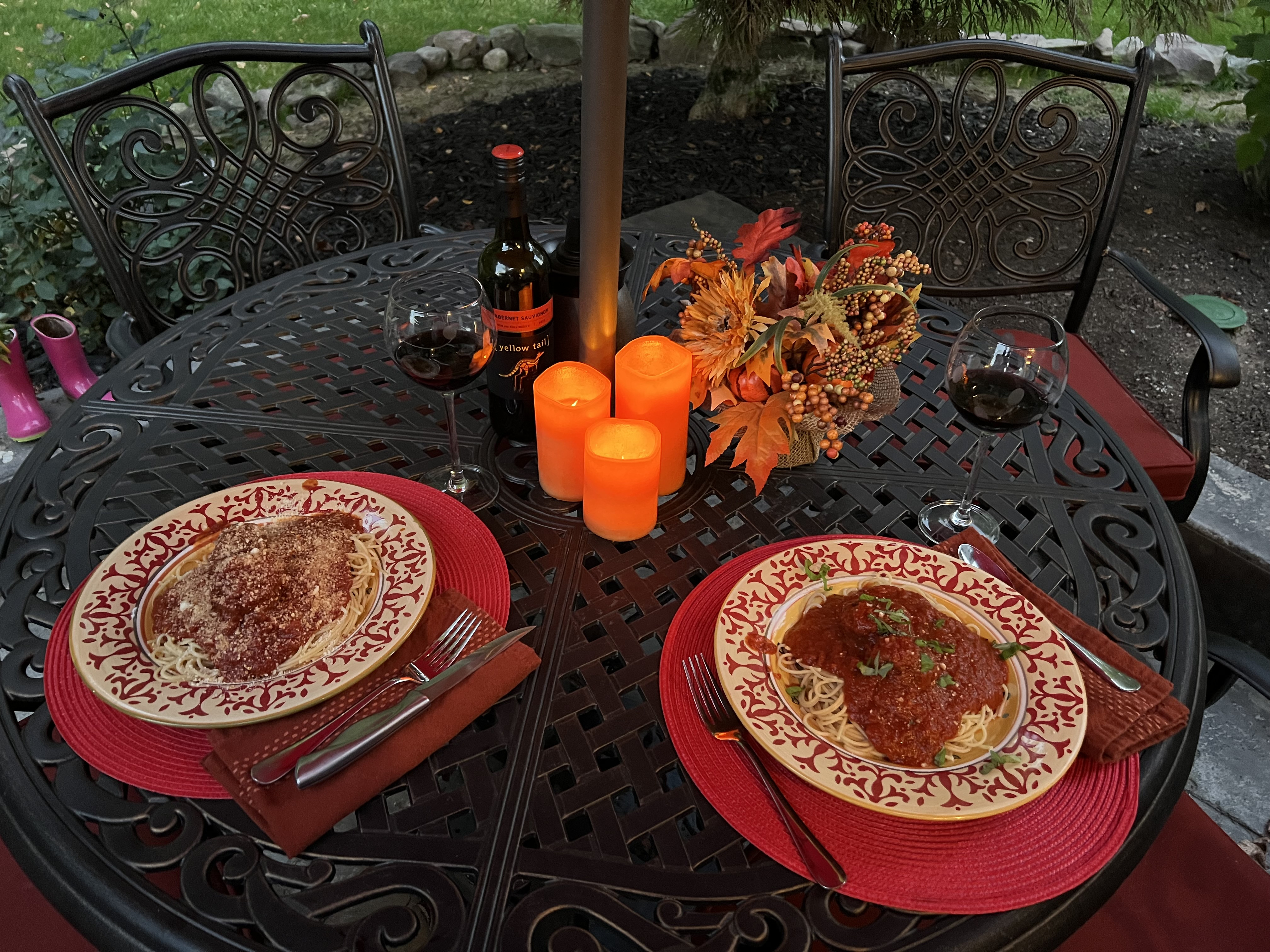 My backyard is my peaceful sanctuary! I always feel better when I am outside. A little pasta on the patio last night.😋