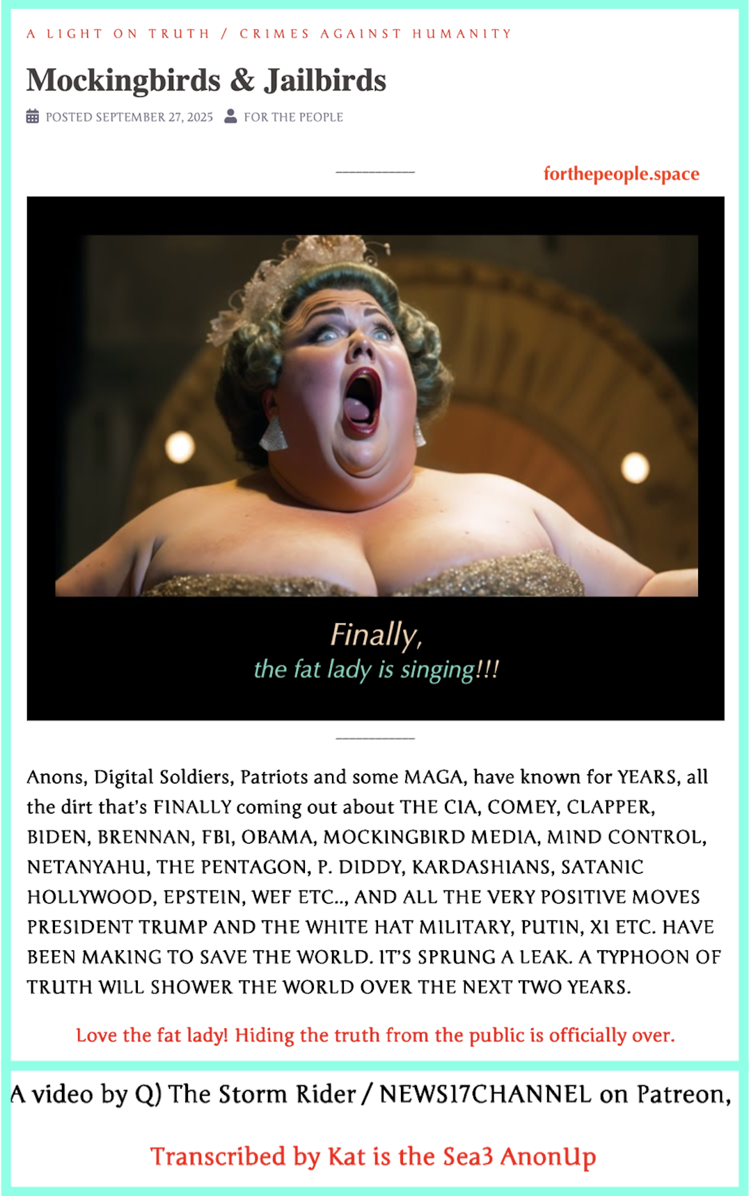 It isn't easy to listen to lengthy videos during the course of the day that are made by all the great Patriots like QTSR, Lt. Col. Riccardo Bosi, Gene Decode Juan, etc., and that's why her transcriptions are so critically important. When it comes to videos, I have to listen to them several times, because I catch something I missed before - and reading text and graphics help get the important information the first time.